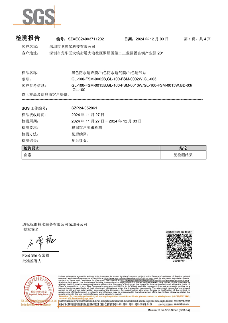 黑色防水透聲膜/白色防水透氣默默/白色透氣貼SGS檢測(cè)報(bào)告